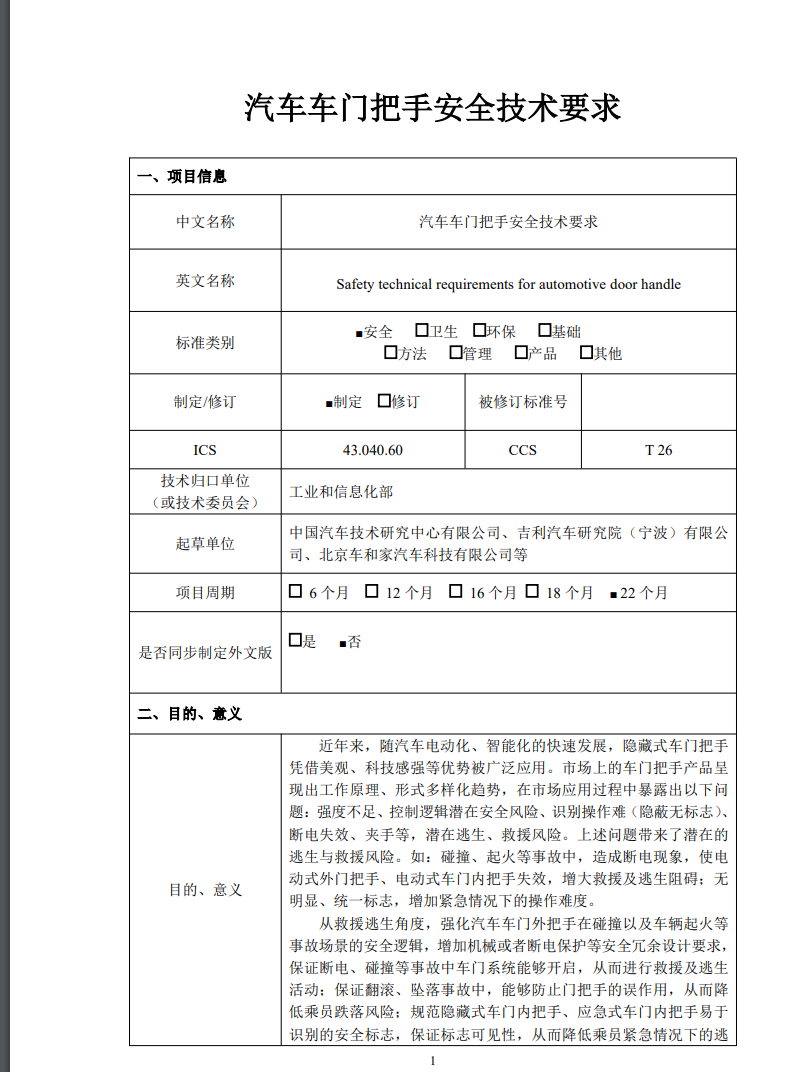 該文件中稱,近年來,隨汽車電動化、智能化的快速發展,隱藏式車門把手憑借美觀、科技感強等優勢被廣泛應用。市場上的車門把手產品呈現出工作原理、形式多樣化趨勢,在市場應用過程中暴露出以下問題:強度不足、控制邏輯潛在安全風險、識別操作難(隱蔽無標志)、斷電失效、夾手等,潛在逃生、救援風險。上述問題帶來了潛在的逃生與救援風險。如:碰撞、起火等事故中,造成斷電現象,使電動式外門把手、電動式車門內把手失效,增大救援及逃生阻礙;無明顯、統一標志,增加緊急情況下的操作難度。