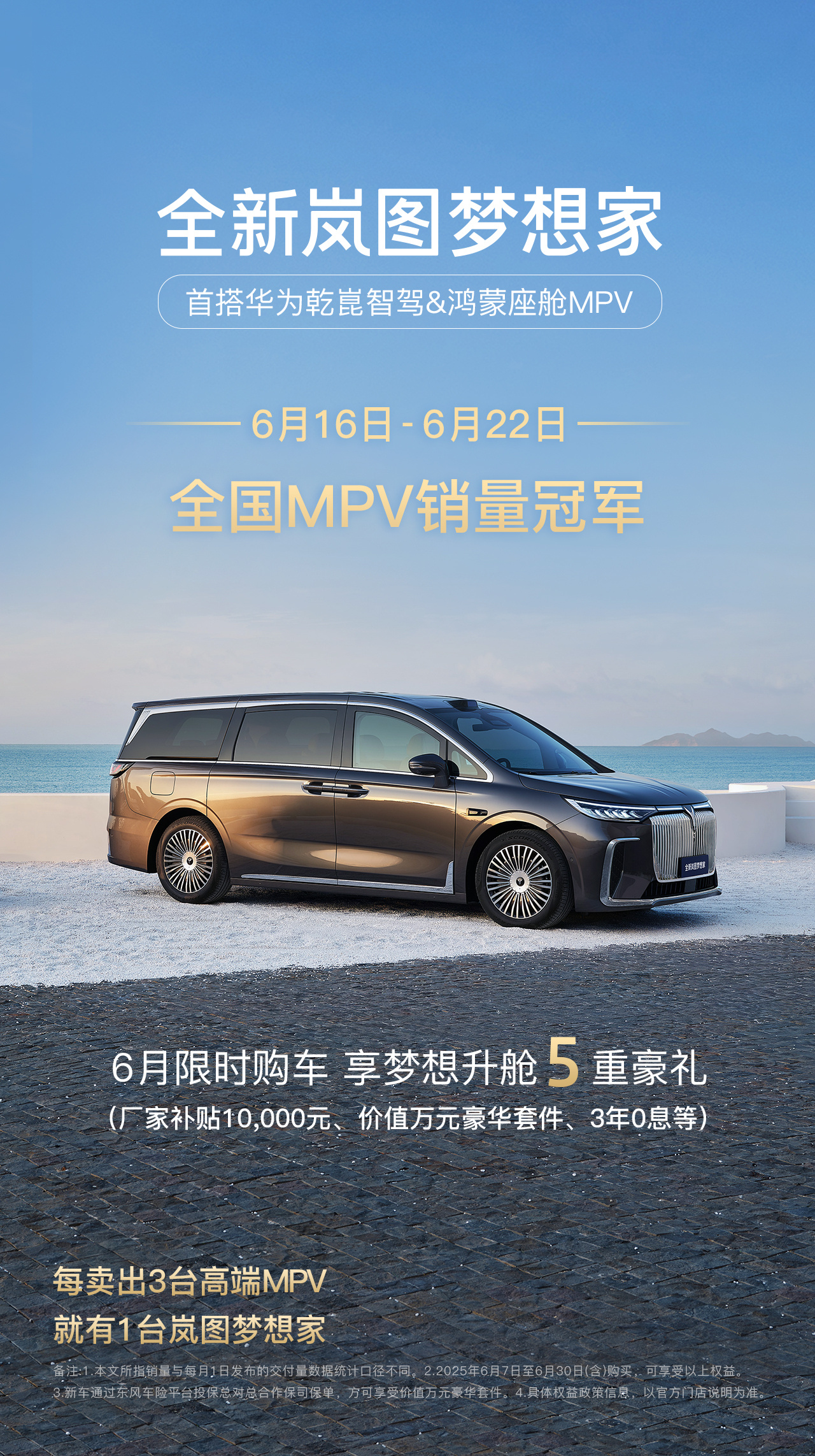 值得一提的是,嵐圖旗下大五座新車嵐圖FREE+于6月24日開啟預售,新車定位極智駕享大五座SUV,標配華為乾崑智駕ADS 4和鴻蒙座艙5,市場目標為細分領域前三,努力成為繼夢想家之后又一熱銷單品。