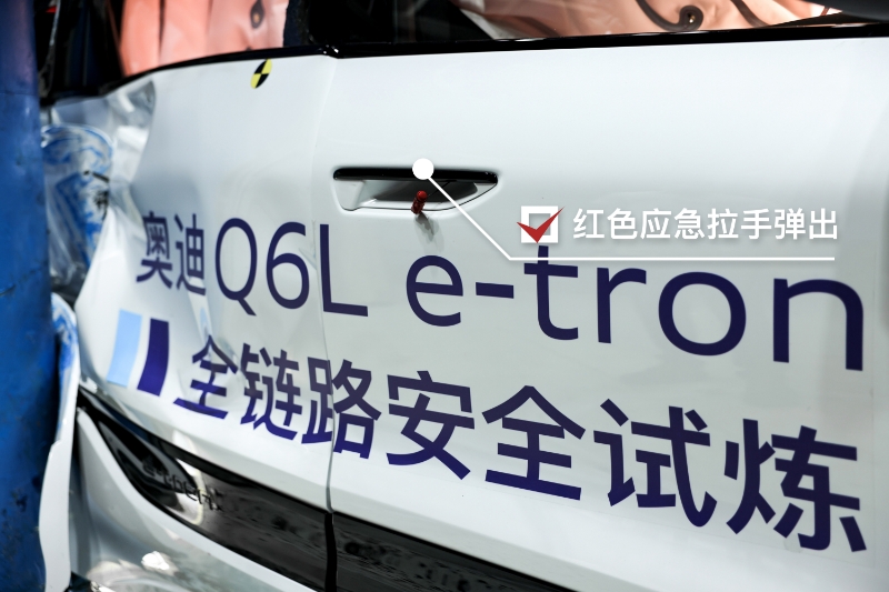 結(jié)果顯示,一汽奧迪Q6L e-tron車身結(jié)構(gòu)完整,A、B、C、D柱均未發(fā)生結(jié)構(gòu)性失效,兩次擠壓下乘員艙依然保持足夠的生存空間。安全帶正常預緊點爆,側(cè)氣囊、側(cè)氣簾及中央氣囊正常展開,全車假人傷害值均處于優(yōu)秀水平。電池組在遭遇“夾心式?jīng)_擊”后幾乎無變形、無位移,經(jīng)受住幾何形變與短路風險雙重考驗,未發(fā)生冒煙、起火、爆炸或電解液泄漏。高壓系統(tǒng)在毫秒級內(nèi)完成高壓斷電,有效避免短路造成熱失控風險。通過科學的走線,有效的結(jié)構(gòu)保護,以及冗余的功能設(shè)計,保障極限場景下低壓電正常工作。半隱藏式車門把手的紅色應急拉手正常彈出,前排車門可正常打開,電動座椅可調(diào)節(jié);車窗自動下降,保障車內(nèi)空氣流動。碰撞后雙閃及時開啟,E-CALL及時啟動并接通人工客服。從堅若磐石的乘員艙結(jié)構(gòu),到周全可靠的碰撞后救援機制等,每一個安全細節(jié)都交出了高分答卷。