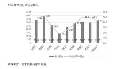 從南京我愛我家研究院針對2018年10月至2019年11月的租金統計中不難看出,今年7月前南京的租賃市場價格相對平穩,波動不大,而在7月、8月、9月呈現出高位震蕩的市場走勢,房屋租金水平在4個月內又回到過去的平均水平線上。從各區的租金來看,除了浦口、雨花臺租金微漲外,其余各區租金在11月均有所下滑,其中,建鄴區的套均租金為3920元,跌破“4”字頭,每平方米的平均租金為52.8元,繼續排在全市第一;鼓樓區11月的套均租金為3363元,環比下滑51元,每平方米的平均租金為50.9元,位居第二;棲霞區的套均租金3285元,秦淮區套均租金3148元,分列第三、四位。