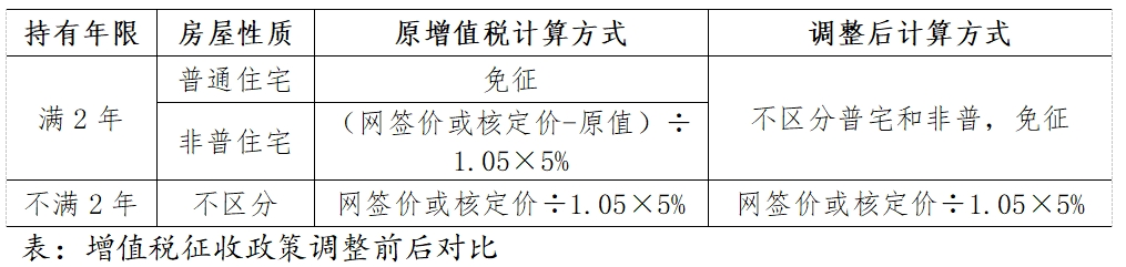 增值稅方面,政策調(diào)整后個(gè)人將購買2年以上(含2年)的住房對(duì)外銷售的,免征增值稅;個(gè)人將購買不足2年的住房對(duì)外銷售的,按照5%的征收率全額繳納增值稅。
