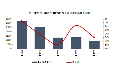 但是綜合來看,2020年-2024年間,TOP100企業拿地總額總體呈下滑趨勢,2024年不足2020年的三成,特別是民營房企拿地銳減,這與房地產市場下行、融資環境偏緊、民營房企違約事件頻發密切關聯。
