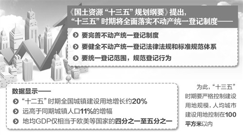 國土資源部今天公布的《國土資源“十三五”規劃綱要》提出,“十三五”時期將全面落實不動產統一登記制度。