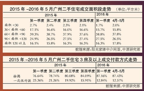 中原研究部監測的陽光家緣數據顯示,120平方米的物業在2016年4月~5月份成交占比較第一季度提升了1.5個百分點,對于打算生二孩的老百姓來說,一方面,人口增多,需要提前購置大房;另一方面,在低利率的時代,買房不僅可以使資產保值增值,對抗通脹,也能利用低利率政策減少購房成本支出。在2016年成交的3房及以上的物業付款方式來看,按揭貸款的占比呈一路走高的態勢,2016年1月~5月份占比在87%的水平,較2015年第三季度多了7個百分點左右。