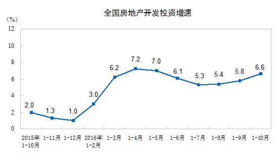 一、房地產開發投資完成情況 2016年1-10月份,全國房地產開發投資83975億元,同比名義增長6.6%,增速比1-9月份提高0.8個百分點。其中,住宅投資56294億元,增長5.9%,增速提高0.8個百分點。住宅投資占房地產開發投資的比重為67.0%。