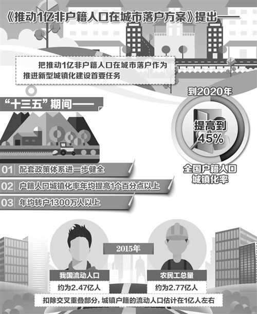 如何推動1億左右農業轉移人口和其他常住人口等非戶籍人口在城市落戶,使有能力在城鎮穩定就業和生活的農業轉移人口舉家進城落戶,是我國推進新型城鎮化面臨的迫切任務。不久前,國務院辦公廳印發了《推動1億非戶籍人口在城市落戶方案》(以下簡稱《方案》)。