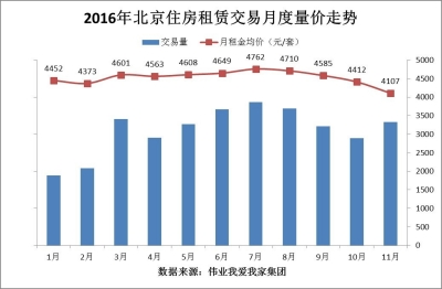 按照慣例,10月之后北京租賃市場進入傳統淡季,剛剛過去的11月,北京月租金均價創年內新低。據偉業我愛我家集團市場研究院統計,2016年11月,北京區域通過我愛我家達成的住宅租賃交易量環比10月同期上漲14.8%,但月租金均價為4107元/平米,環比10月下跌6.9%。