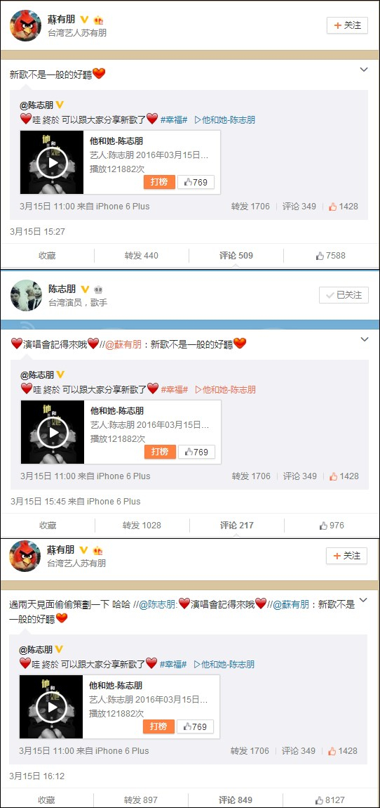 3月15日下午,臺灣歌手陳志朋在微博宣傳自己的新歌《他和她》,之前曾和陳志朋傳過不合的小虎隊另外一個成員蘇有朋第一時間轉發了該微博,并大贊“新歌不是一般的好聽”,幾分鐘后,陳志朋回復“演唱會記得來哦”,正當大家以為互動就這么結束的時候,蘇有朋“過兩天見面偷偷策劃一下 哈哈”。