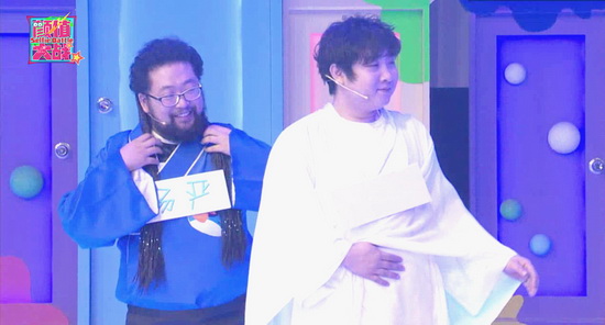 一開場(chǎng)兩人被發(fā)糖——“選妃”可抱美人歸。遮擋住臉龐的各位“妃子”穿著古風(fēng)裙,俏麗非凡的樣子讓兩位嘉賓欣喜不已,想著總算可以和漂亮的姑娘們搭檔了,誰(shuí)料半路殺出王守英,頭戴瓜子身披綠紗,一身自制衣服就劫走了喬杉,看著這二人配對(duì)成功,修睿還做著自己會(huì)和小美女搭檔的美夢(mèng),然而張大大直接判決,修睿配對(duì)小甜甜。