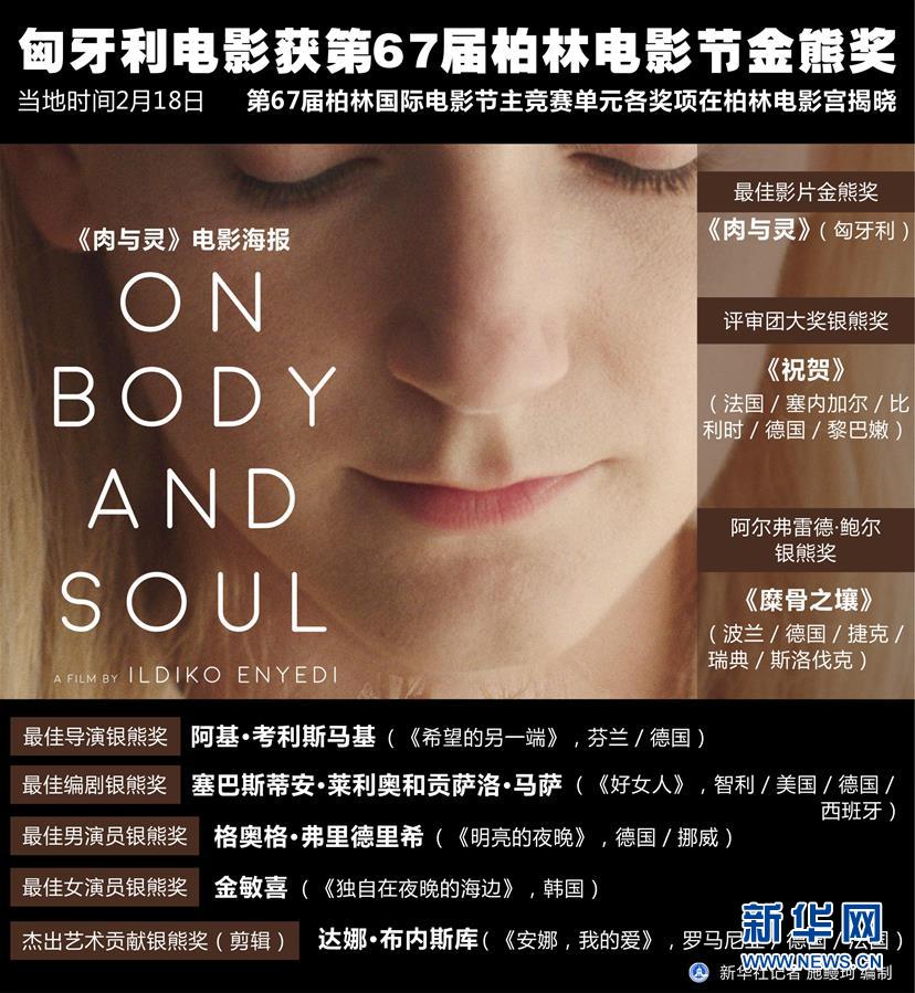 新華社柏林2月18日電(記者張毅榮)第67屆柏林國際電影節主競賽單元各獎項18日在柏林電影宮揭曉,匈牙利電影《肉與靈》獲最佳影片金熊獎。