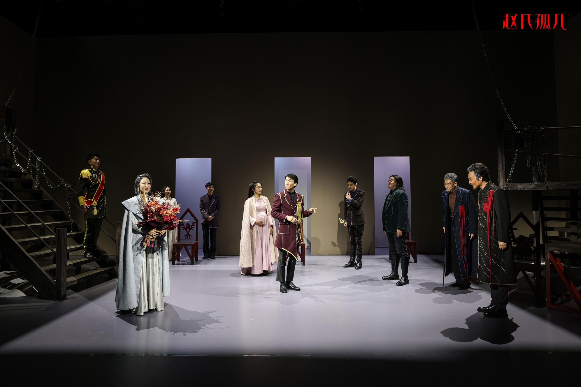 整部作品的敘事風格相當獨特,劇中場景眾多,幕與幕之間沒有傳統的起承轉合,而是以片段的形式迅速切換,快速且激烈地展現了相當復雜的角色關系和劇情發展。金漢、周帥、李麟、石云鵬、徐菁遙等十余位青年演員在沒有大量背景鋪墊的情況下,在舞臺上迅速立住了人物:金漢飾演的程嬰忠誠隱忍,最終,卻在謊言與喪子之痛的多年折磨下變得形容枯槁;周帥飾演的屠岸賈深沉陰狠,年老后孤獨憔悴;石云鵬飾演的晉靈公看似多病懦弱,實際上深諳朝野馭人之道,他默許甚至操縱著臣子間的廝殺傾軋……一眾青年演員在表演時爆發出的力量,的確有許多可圈可點之處。