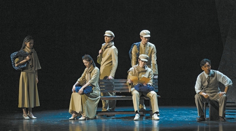 舞美設計需要構建出復雜廣闊的時間和空間內容范疇。多組道具營造出了多層次的視覺空間,結合話劇本身的語言邏輯共同推進情節,有回溯有瞻望。舞臺上三組沿幕側幕,以扭曲傾倒的造型和鐵銹斑斑的質感,營造出危險動蕩的革命時代氛圍。對于影響新中國文藝發展歷程的幾部經典作品,通過呈現其創作過程,指向漸趨明朗的人物命運。相隔數年、不同角色的命運情境得以靈動地銜接、組合,人物在時空中不斷跳進跳出,實現敘述的自由。