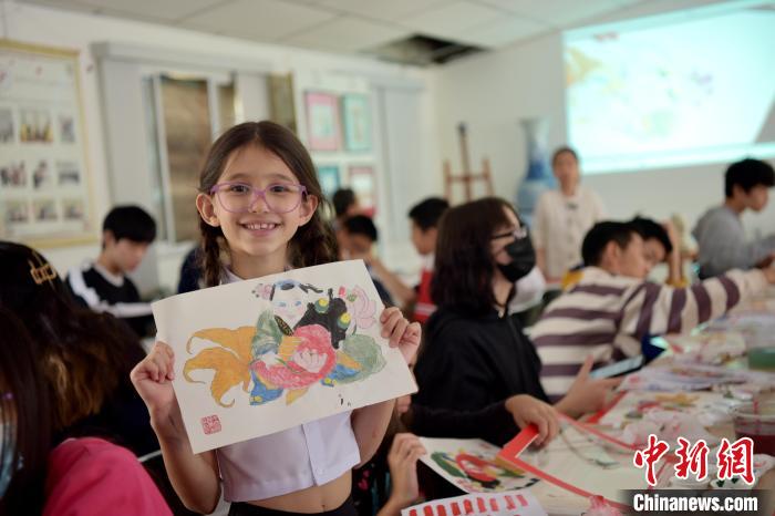 當地時間9月10日,天津楊柳青木版年畫博物館、巴西圣保羅華僑天主堂中文學校聯合舉辦年畫傳承研習活動。圖為一位巴西小學生展示她的年畫涂色作品。中新社記者 林春茵 攝