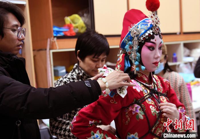 演出開始前,該劇主演劉泳渤在工作人員的協助下調整戲裝。 中新網記者劉可耕攝