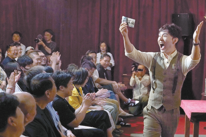 鄧男子(右)在觀眾面前展示近景魔術。記者 方非 攝 “爆笑梗”讓現場笑聲不斷 走進天橋藝術中心三層的新空間劇場,紅色的幕布和流轉的燈光,預示一段奇幻的旅程即將開啟。“您好,請領取一個身份牌。”在工作人員的示意下,觀眾從“大哥”“二妹”“小舅子”“外婆”等親戚身份牌中選擇一個,夾在衣服上,就正式進入了《男巫客廳》的世界。 領取完身份牌向左手邊看去,一個維多利亞裝修風格的客廳出現在眼前。沙發、書桌、老式電話應有盡有,墻上還掛著文藝的裝飾畫和各種樂器。再往前走,中式風格的古樸方桌上擺著花生、瓜子和北冰洋汽水,想必是嘮家常的好地方。 穿過長廊走到表演區坐定,鄧男子正式開始了《男巫客廳》的表演。傳統魔術表演的舞臺與觀眾席距離甚遠,而在這里,鄧男子就站在觀眾面前。在無數人的視線中,他毫無破綻地表演中外魔術與戲法,當場口吞刀片,讓撲克牌鉆進氣球,還能在一顆新鮮完好的橙子里找到紙幣。就連在大型舞臺上出現的“大卸八塊”魔術,鄧男子都將它搬到觀眾面前,當多支鋼錐刺穿紙箱,里面的“氣功大師”卻毫發無損,觀眾無不瞠目結舌。 除了精彩的魔術表演,鄧男子還總能拋出一個個“爆笑梗”。現場每一位觀眾的反應,都會為這場魔術脫口秀增加互動環節,“接下茬”的觀眾、懵懂的小朋友、文藝范的大叔,都能成為他的互動對象。全場演出沒有一個低俗梗,只有令人叫絕的即興反應和精彩的魔術,讓觀眾度過一個快樂的夜晚。 落地北京新增獨家情節 享有魔術界“奧斯卡”美譽的梅林獎雙料得主、2022年央視春晚魔術師鄧男子推出的魔術脫口秀《男巫客廳》,此前曾在長沙和上海演出,此次與北京天橋藝術中心合作,全新增加了“喬氏家族”的背景故事。 “北京天橋是民俗文化的發源地,古彩戲法非常有名,我們邀請鄧男子來這里演出,希望他能把西洋魔術和天橋戲法結合,也希望給觀眾帶來一個更完整的故事。”北京天橋藝術中心演出經營中心總監姜瓊說,天橋藝術中心的團隊設計了一個完整的故事臺本:這里是天橋戲法界傳奇人物喬老爺的家,喬老爺生有二子,其中喬二爺的長子繼承祖父的衣缽,并前往國外學習魔術,歸來后將老宅翻新,邀請親朋來到自家客廳,為大家表演魔術戲法。中西的碰撞、傳統的賡續就此展開。 演出前,觀眾可以在預演區解鎖喬老爺家的“番外情節”。姜瓊透露,她與天橋藝術中心的多位工作人員都將化身喬家的家人,和觀眾互動聊天,不同場次會有不同的“家人”現身。劇場兩側的墻壁上也掛有西洋魔術和東方傳統戲法的圖片,觀眾可以通過這些細節感受傳統文化在現代的發展。 這些獨具匠心的設計,是北京版《男巫客廳》所獨有,在全國僅此一家。鄧男子對天橋藝術中心的安排感到驚喜,“我是學西洋魔術的,但在我心里,北京天橋是中國近現代互動魔術的發源地,在這個獨特的空間里演出,我感到了傳承的力量。” 探索演藝新空間發展新模式 演藝空間的活化利用,一直是天橋藝術中心探索的方向,通過打造《貓神在故宮》《男巫客廳》兩部新空間劇目,天橋藝術中心展現了北京文化力量在演藝新業態領域探索的示范作用,也為打造文化消費場景創造了全新的可能。 天橋藝術中心的新空間劇場,原本是位于三層的一處閑置空間,獨立于藝術中心的四個劇場之外。天橋藝術中心黨支部書記、副總經理楊樹聰介紹,這個空間在挑高上有一定局限,從充分利用空間方面考慮,天橋藝術中心自2016年就嘗試在這里做展覽,逐步嘗試商業化。直到去年,新空間劇場推出《貓神在故宮》,并入選北京市文化和旅游局主辦的北京市演藝服務平臺首次推出的15家演藝空間培育項目,開啟了新的發展篇章。 “我們想探索的演藝新空間,不僅要打破傳統舞臺的‘第四堵墻’,還希望觀眾從踏進預演區的那一刻起,就已經進入了演出的情境,體驗劇情氛圍,而不是只面對一個孤零零的演出空間。”楊樹聰說,這一理念在《貓神在故宮》和《男巫客廳》中得到充分應用。觀眾在《貓神在故宮》的預演區可以鉆“貓洞”,體驗“小貓”的生活;《男巫客廳》里,領取身份牌的觀眾可以在空間中“尋蹤覓跡”,拼湊出天橋老藝人的家族故事,享受滿滿的體驗感。 說起未來新空間劇場的發展方向,楊樹聰說,目前在天橋藝術中心熱演的音樂劇、舞劇、話劇、親子劇等演出形式,都有可能與新空間聯動,在全新的觀演關系下呈現,“天橋藝術中心希望通過新劇場空間的探索,為城市更新和商業空間功能拓展提供參考樣本,不斷繁榮演藝文化市場,助力北京‘演藝之都’建設。”記者 韓軒 (責任編輯:盧相汀) |