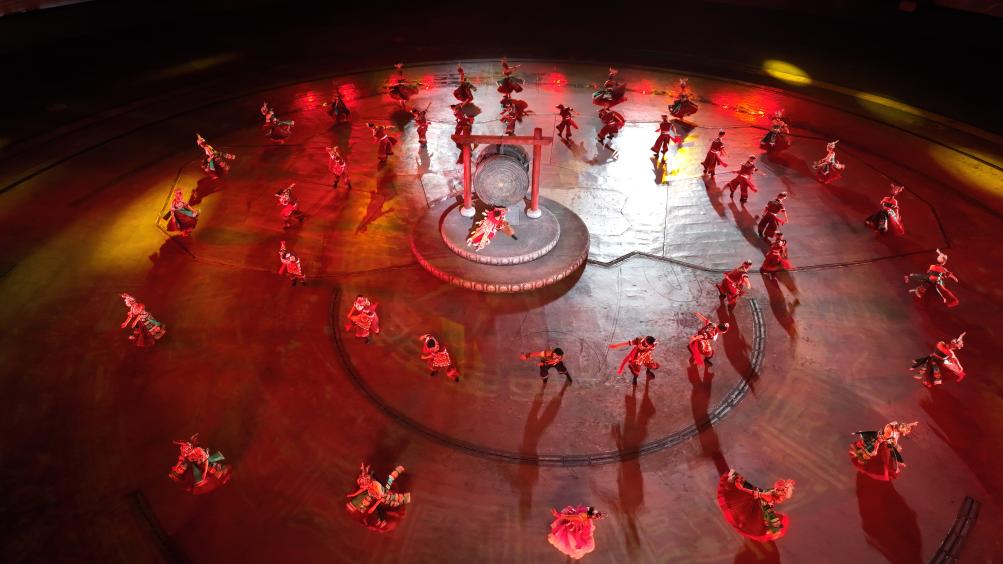 9月20日晚,演員在貴州省雷山縣大塘鎮表演苗族歌舞詩劇《仰歐桑》(無人機照片)。新華社記者 楊文斌 攝
