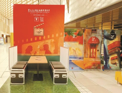 在陸家嘴百麗宮影城的主視覺海報前,一桌二椅皆成實景,影迷可以入內拍照留念,也可在此交談、小憩。 上海國際電影節供圖