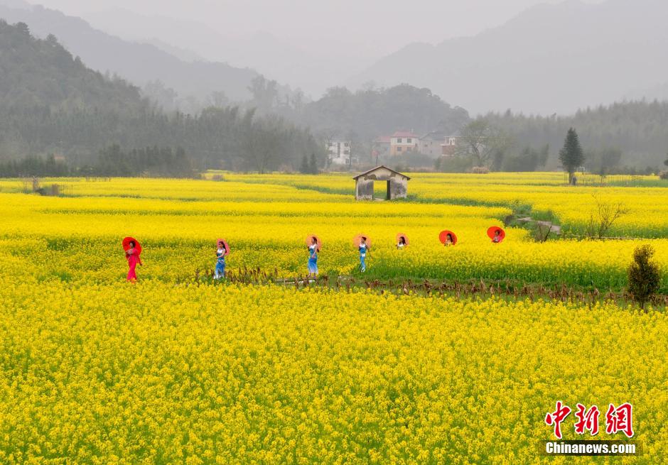 3月20日,江西省德興市海口鎮杜村婦女在田間花海“走秀”。當日,江西德興市海口鎮杜村一批家庭婦女以千畝油菜花海為舞臺,展示自己的才藝形象,希望宣傳家鄉的自然生態與人文歷史,擴大旅游知名度和影響力。德興市海口鎮杜村交通便利,自然風光優美,村內有歷史古跡和名木古樹。 胡敦煌 攝