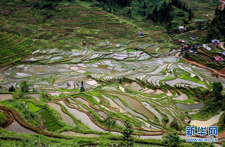 5月20日在廣西柳州市融水苗族自治縣桿洞鄉(xiāng)拍攝的梯田。廣西柳州市融水苗族自治縣桿洞鄉(xiāng)平均海拔780多米,是全縣高海拔鄉(xiāng)鎮(zhèn)之一。這里的梯田多在高山,人們稱之為“天上糧倉(cāng)”。時(shí)下,“天上糧倉(cāng)”或儲(chǔ)水待插,或新秧初栽,如織錦一般美不勝收。新華社發(fā)(龍濤 攝) |