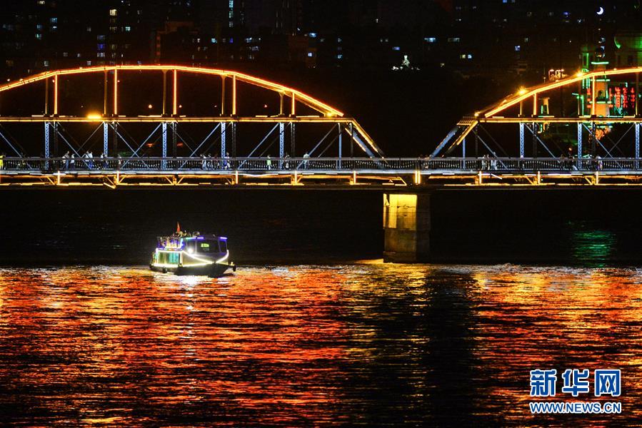 6月14日,一艘游輪從黃河蘭州段中山橋下穿過。自6月12日起,蘭州黃河游輪夏季夜航航線正式開通。據了解,作為黃河蘭州段水上旅游重點線路,該航線由蘭州市城關區蘭州港碼頭和白塔山碼頭始發,每晚20時起開行,全程約6公里,運行時長50分鐘左右。游客可以乘坐豪華游輪欣賞黃河夜景,感受蘭州黃河風情線別樣魅力。新華社記者 陳斌 攝
