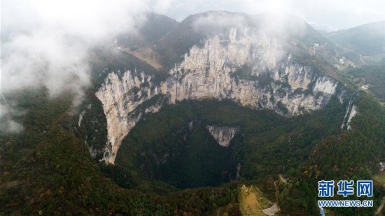 這是11月28日航拍的重慶奉節小寨天坑。小寨天坑位于重慶市奉節縣興隆鎮小寨村,坑深666米,是聞名中外的世界地質奇觀。 新華社發