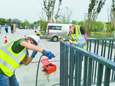 上午9時,安裝工作正在進行,大約20只“小金鳥”陸續進入最后的焊接階段。現場施工負責人郭中戌師傅告訴記者,“和原來那批相比,小鳥的牢固程度增加了三倍以上。”記者看到,鋁制鳥身下方連接著一個長而細的不銹鋼管,鋼管穿透護欄,欄桿上方的部分噴膠,欄桿下邊的部分擰緊螺絲后再加一層焊接。