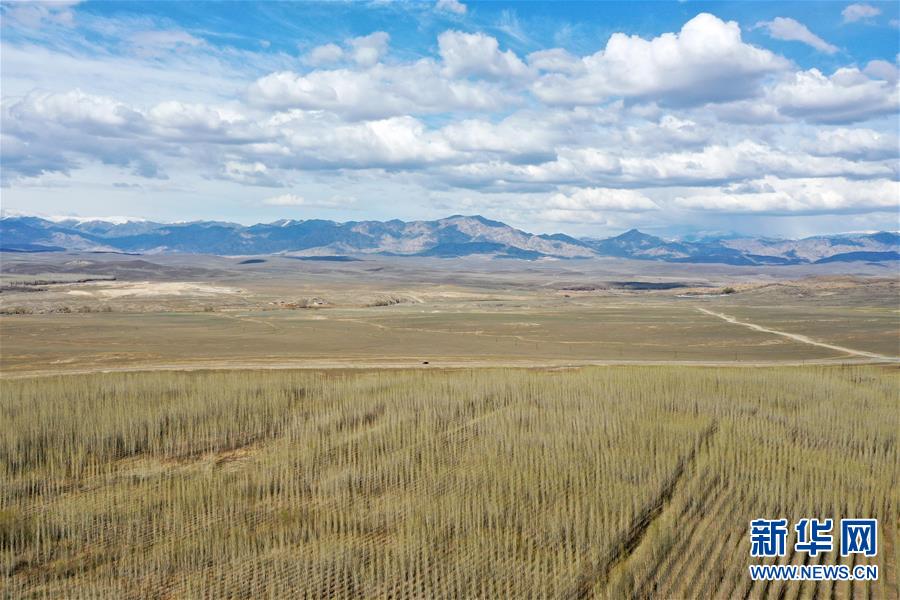 與阿勒泰市中水回用環境治理示范園林地一路之隔的就是戈壁灘(4月19日攝,無人機照片)。 近年來,新疆阿勒泰市利用經污水處理廠處理達標后的中水,灌溉建在戈壁灘上的苗圃基地,形成良性循環,助力綠化工程,改善生態環境。從2017年至今,阿勒泰市中水回用環境治理示范園已為當地綠化工程提供40萬株樹苗,實現5000畝荒山綠化。 新華社記者 丁磊 攝