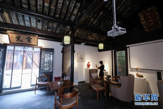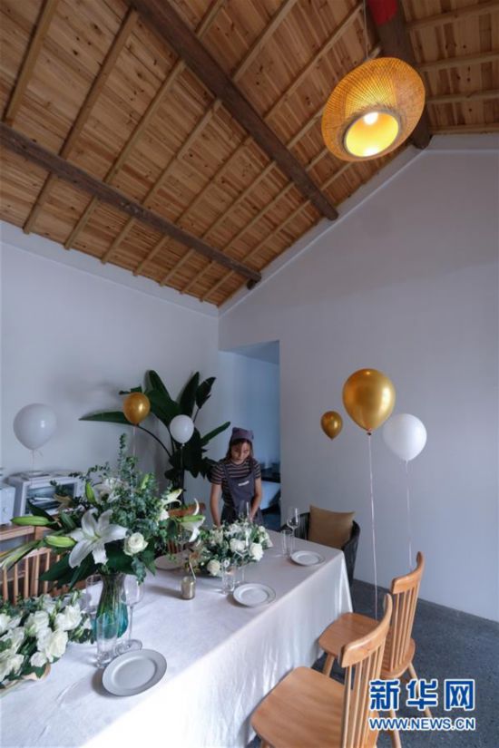 5月28日,湖州市織里鎮廟兜村“三葉屋”民宿工作人員在整理客廳。該民宿由舊屋改造而成,集餐飲、書屋、住宿于一體。 新華社記者 徐昱 攝
