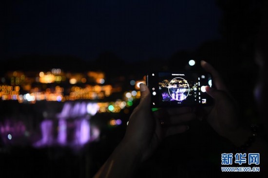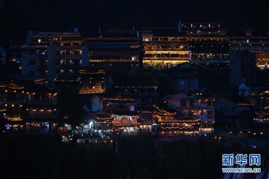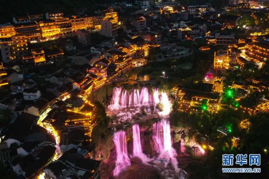 近日,湘西土家族苗族自治州永順縣芙蓉鎮景區在做好疫情防控的情況下恢復開放。夜幕降臨,景區內的瀑布、吊腳樓與燈光交相輝映,美不勝收,吸引許多游客前來休閑、參觀。