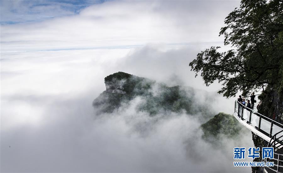 6月10日,游人在漢中市南鄭區龍頭山景區玻璃棧道上觀賞云海。 新華社記者 陶明 攝