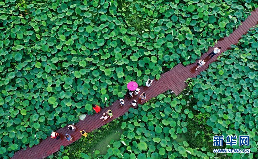 6月28日,游客在廣西柳州市柳江區百朋鎮萬畝荷塘里游玩。新華社發(黎寒池 攝)