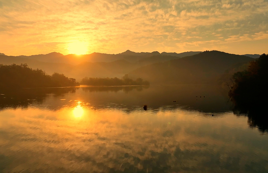 10月29日,在安徽省池州市的秋浦河畔,朝霞與水面相映成趣,泛舟秋浦河仿佛置身仙境。秋浦河是長江支流,風光秀美,因唐代詩人李白的《秋浦歌十七首》等詩作而聞名。新華網發(王帆 攝)