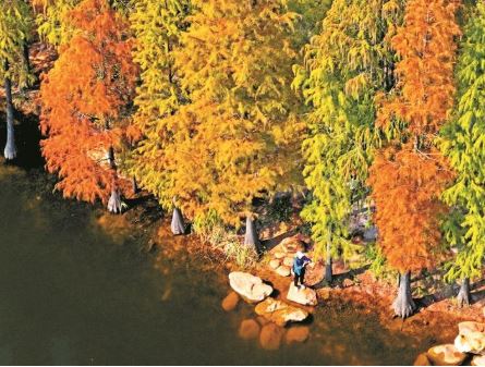 隨著天氣轉冷,廣西南寧市多個公園的杉樹樹葉愈發紅艷,分外靚麗。圖為12月21日,市民在廣西南寧市青秀山風景區的杉樹林里游玩。 新華社記者 周華攝