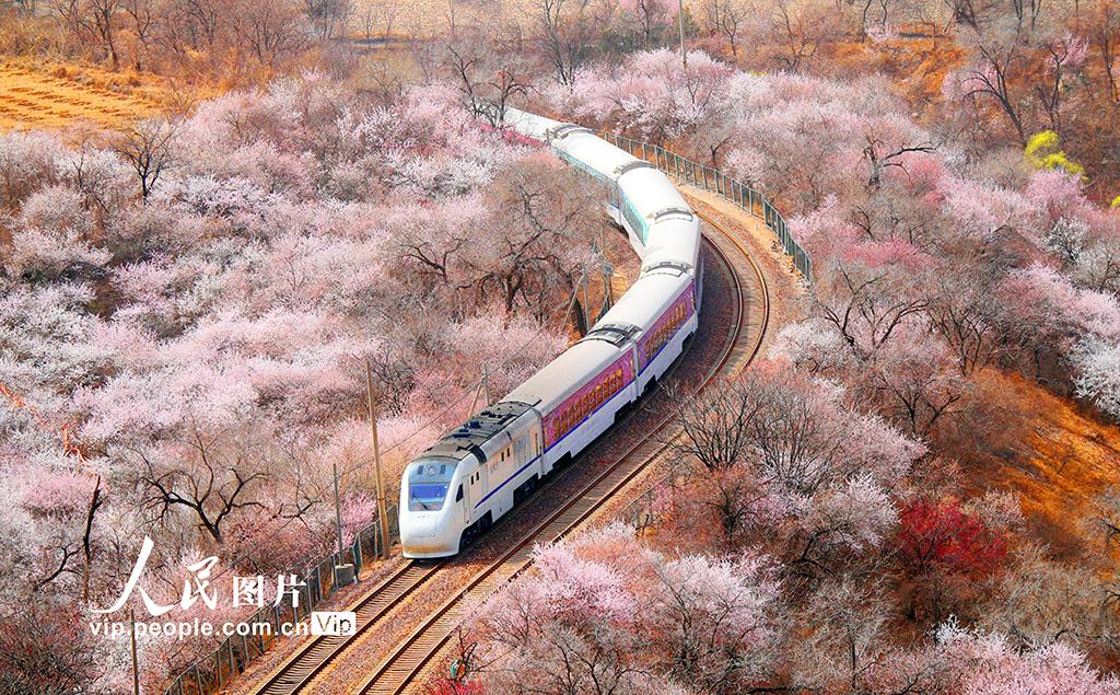 2025年3月23日,居庸關長城腳下繁花似錦,北京市郊鐵路S2線列車悠然穿行其間,該線列車因途經多處風景名勝,被贊譽為“開往春天的列車”。張秀科攝(人民圖片網)