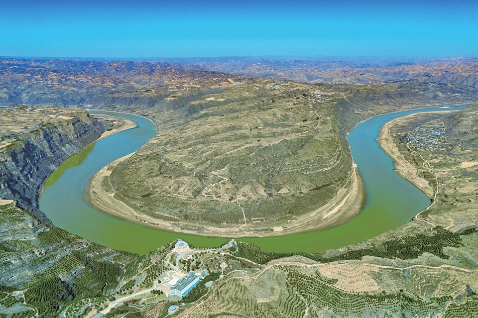 3月20日,俯瞰位于永和縣的乾坤灣景區,蜿蜒的黃河、碧綠的河岸組成了一幅壯美的山水圖景,美不勝收。