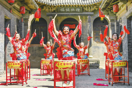 ②4月28日,太谷區文化館親疙蛋鼓舞隊隊員正在三多堂景區排練,為即將到來的“五一”假期展演做準備。