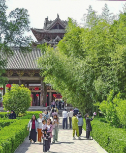 ③4月26日,游人在萬榮縣東岳廟游玩,在宜人的春光里觀賞純木質結構建筑飛云樓,感受傳統文化的魅力。
