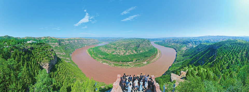 8月19日,游客在永和縣乾坤灣景區游覽觀光、合影留念。近年來,該縣不斷提高當地森林覆蓋率,并依托紅色旅游資源發展文旅經濟,把東征村156孔窯洞改造成民宿旅館,增加了村集體和村民收入。