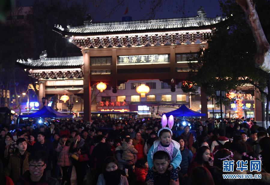 2月22日晚,游人在夫子廟景區觀燈游玩。當晚,在江蘇南京夫子廟秦淮風光帶舉辦的秦淮燈會彩燈齊放,人們前來觀燈鬧元宵。 新華社記者孫參攝