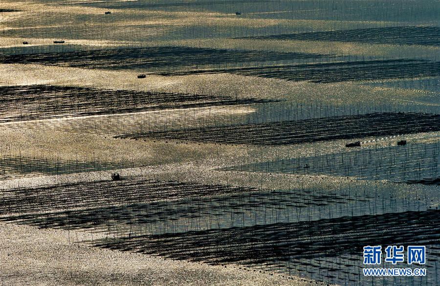 12月9日,夕陽西下,一艘漁船穿行在海上紫菜養殖架間。福建省寧德市的霞浦縣以美麗的淺海、灘涂聞名,豐富的旅游資源和人文資源一直是攝影師追逐的靈感所在。 新華社記者魏培全攝