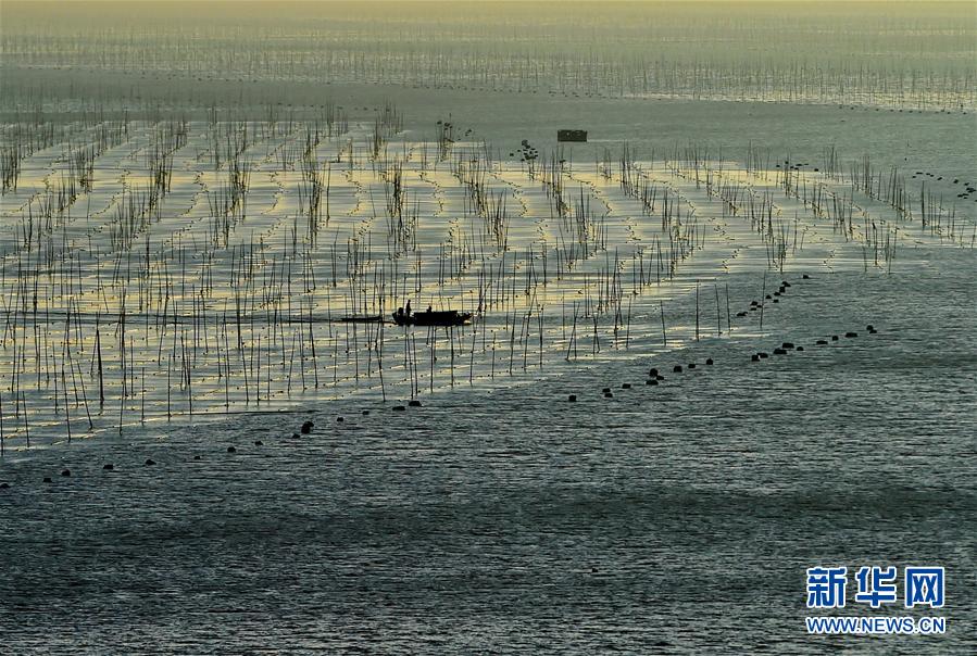 12月9日,夕陽西下,一艘漁船穿行在海上紫菜養殖架間。福建省寧德市的霞浦縣以美麗的淺海、灘涂聞名,豐富的旅游資源和人文資源一直是攝影師追逐的靈感所在。 新華社記者魏培全攝