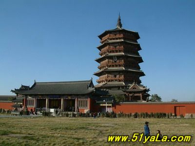 應縣木塔佛宮寺釋迦塔位于山西省應縣城內西北佛宮寺內。俗稱應縣木塔。塔總高67.31米,是我國現存時代最早的木結構高層建筑.佛宮寺釋迦塔建于后晉天福年間,遼清寧二年(1056年)重修。 木塔建造在高大臺基上,臺基高4米余,分上下兩層。上層的臺基和月臺各角,都有角石,從角石上突起的獅子來看,雕刻風格古樸,應是遼代的貴物。木塔總高67.31米,其中塔剎高約10米。塔平面八角形,底層直徑30.27米。塔有五個明層,各層間又夾有暗層,實為九層。底層為重檐并有回廊,故塔的外觀為六層屋檐。塔的整體比例適當,其外形也顯得穩重而莊嚴。