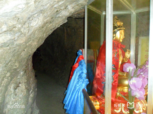 從臺懷寺廟集群區沿公路南下二十里到白云寺,轉向西入溝登山路五里,就到了佛母洞。一座屏障似的山崖,在接近山頂處有一段巖壁,右側有天然大山洞。