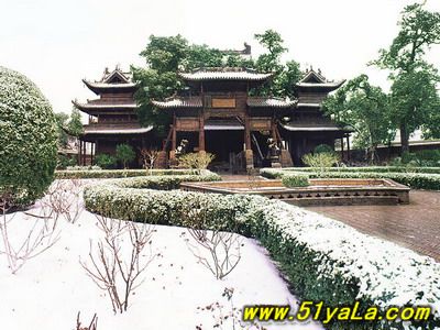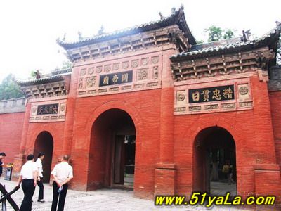 前行有午門.是一座面闊五間,單檐廡殿頂、石雕回廊的廳式建筑。周圍有石欄桿,欄板正反兩面浮雕各類圖案、人物144幅,洋洋大觀,頗有童趣。廳內南有周倉、廖化畫像,軒昂威武。北面左右兩側,彩繪著關羽戎馬一生的主要經歷,起于桃園三結義,止于水淹七軍,只是沒有走麥城這個情節,在全國關廟壁畫中都按此進行,據說這是因忌諱關羽自高自大而被殺,終于造成蜀國的覆滅而隱去的。穿過午門,經“山海鐘靈”坊、御書樓,便是關帝廟主體建筑崇寧殿。