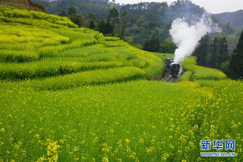 3月19日,一輛小火車從樂山市嘉陽鎮的油菜花田中駛過。早春時節,四川省樂山市嘉陽鎮的油菜花競相綻放,一派春意盎然的景象。 新華社發(張偉 攝)