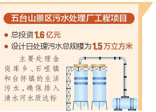 五臺山景區污水處理廠工程項目總投資1.6億元,設計日處理污水總規模為1.5萬立方米,主要處理金崗庫鄉、石咀鎮和臺懷鎮的生活污水,確保排入清水河水質達標。