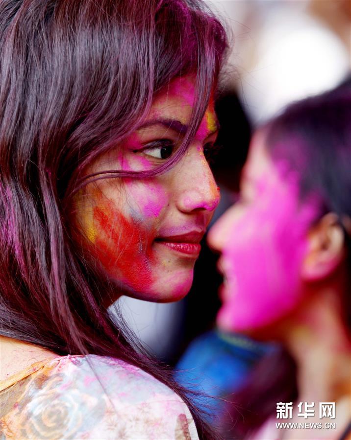 胡里節也叫“灑紅節”,人們在自己臉上和身上涂上顏料,還向別人拋撒五顏六色的顏料和粉末,迎接春天的到來。新華社發(吳昂 攝)