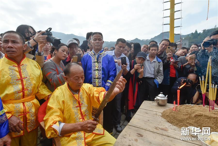 農歷十月十五前后,福建西部武平縣各山村陸續進入農閑時節。按照當地風俗,不同村子各自擇日舉辦民間活動,其中較有代表性的就是“上刀山”絕技。“上刀山”絕技在閩西山村流傳已有數百年歷史,表演者需光腳順著磨得鋒利閃亮的36把鋼刀,攀登至8米高的杉木柱子頂部,接受長者祝福,祈求風調雨順、五谷豐登。新華社記者 宋為偉 攝
