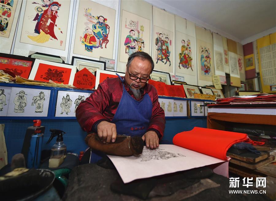春節期間,山西省新絳縣的絳州木版年畫傳承人吳百鎖忙得不可開交,來購買“吉祥如意”“雄雞一唱天下白”等主題年畫的顧客絡繹不絕。山西省非物質文化遺產絳州木版年畫發端于宋金,興盛于明清,從選料到雕刻再到上色都非常講究,一幅年畫的制作需要七八道精細工序。隨著時代的變遷,目前已鮮有專職雕刻、印制年畫的匠人。擁有嫻熟雕刻技藝的吳百鎖在傳承傳統工藝的基礎上,積極創作現代題材的作品,希望通過自己的創新讓更多少年兒童了解并愛上木版年畫,讓這門幾乎失傳的技藝綻放新的光彩。新華社記者 曹陽 攝