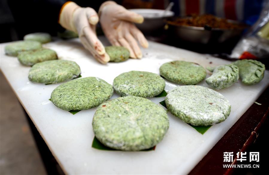 4月2日,黃山市徽州區西溪南村村民在制作清明粿。清明將至,安徽省黃山市徽州區的農家忙著制作清明粿。清明粿是當地清明時節的特色小吃,將新鮮艾草汁拌入糯米粉,再填入徽州特色風味的火腿肉、筍丁、肉絲蘿卜丁等原料做成的餡,捏合成清明粿,蒸熟即可食用。新華社發(周牧 攝)